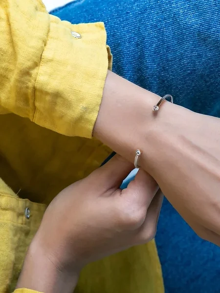 avatud võrukujuline käevõru, mis on kaunistatud kahe särava kristalliga.