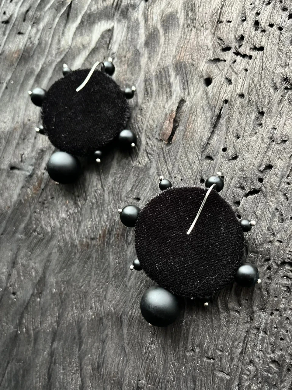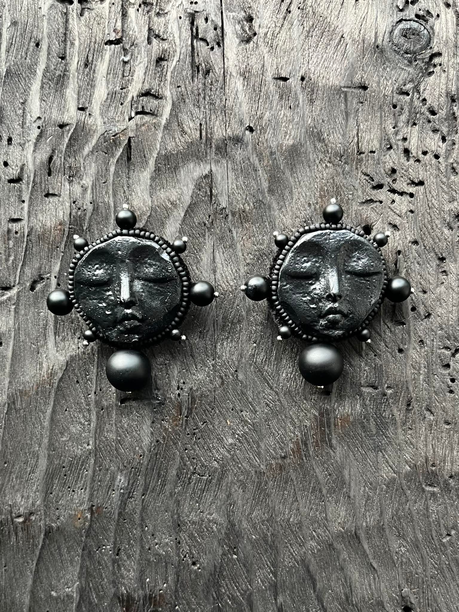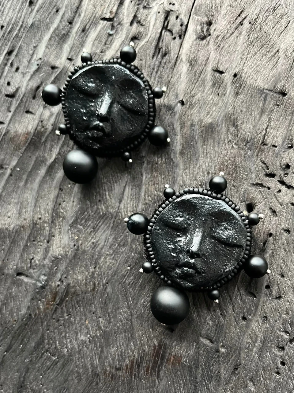 C H I kõrvarõngad Black Moon Face - Must polümeersavi, oonüksihelmed, Tšehhi klaashelmed
