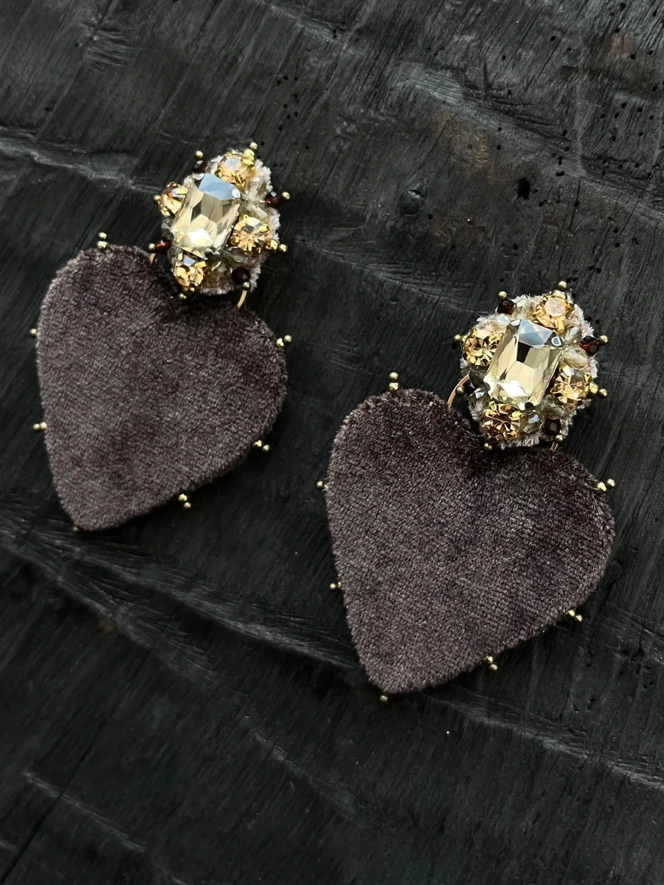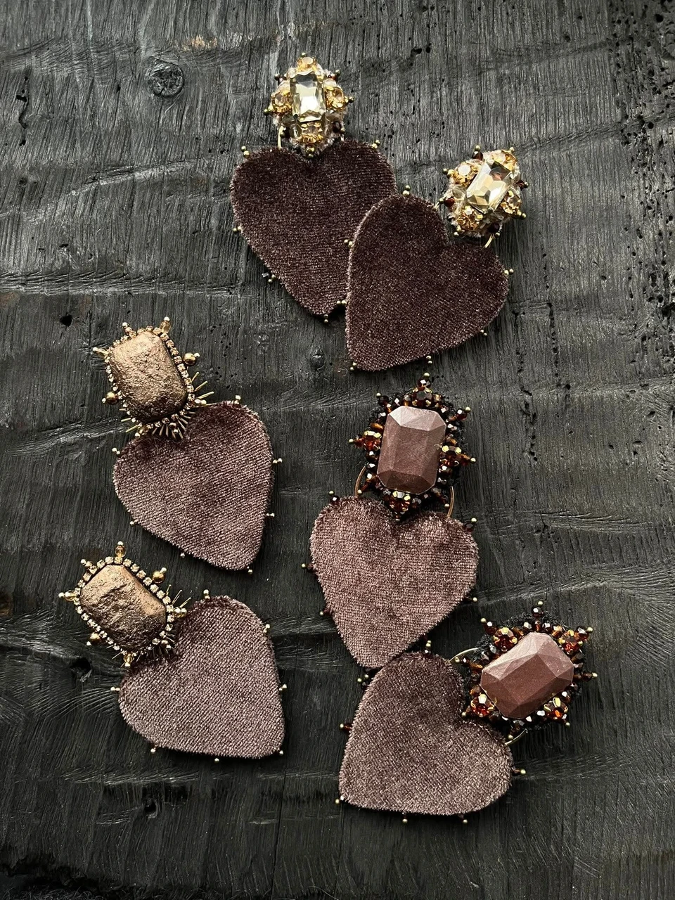 C H I kõrvarõngad Brown Velvet Heart - pruun samet, Tšehhi kristallhelmed, säravad kristallkivid
