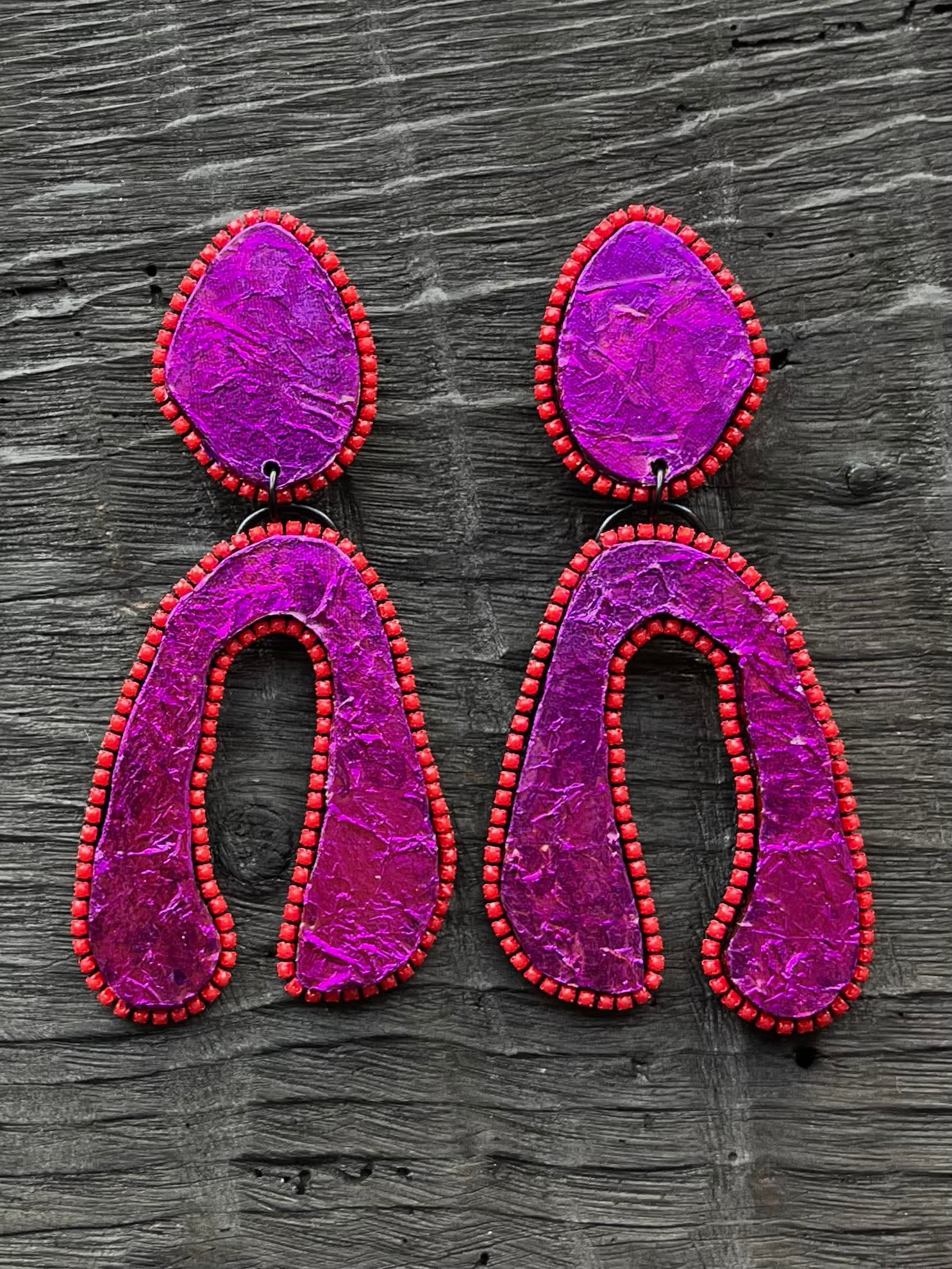 C H I kõrvarõngad Lilac Foil Irregular -Metallik lilla foolium, punased klaashelmed