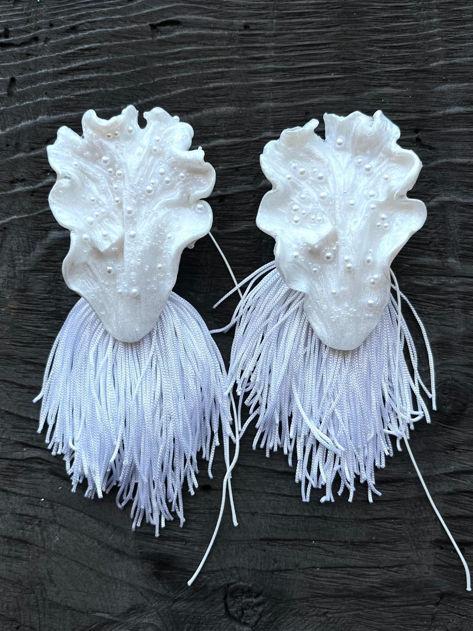 C H I kõrvarõngad White Petal With Pearls And Tassel - Valge polümeersavi, pärlhelmed, eemaldatav valgetest narmastest ripats