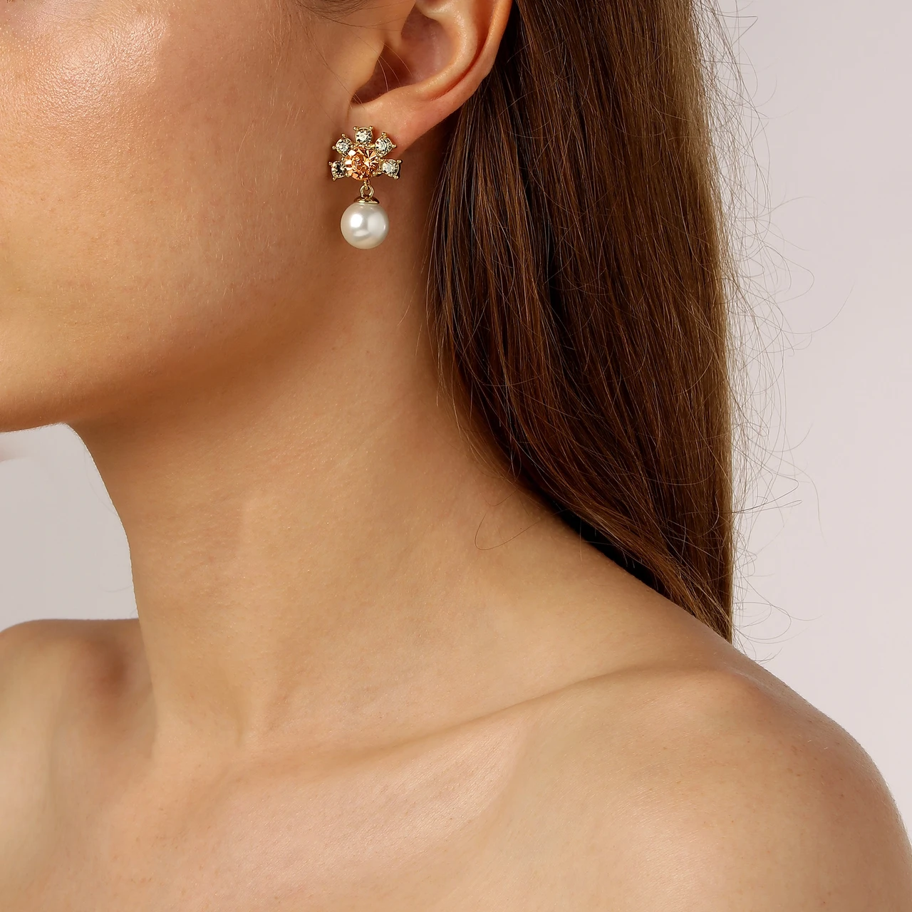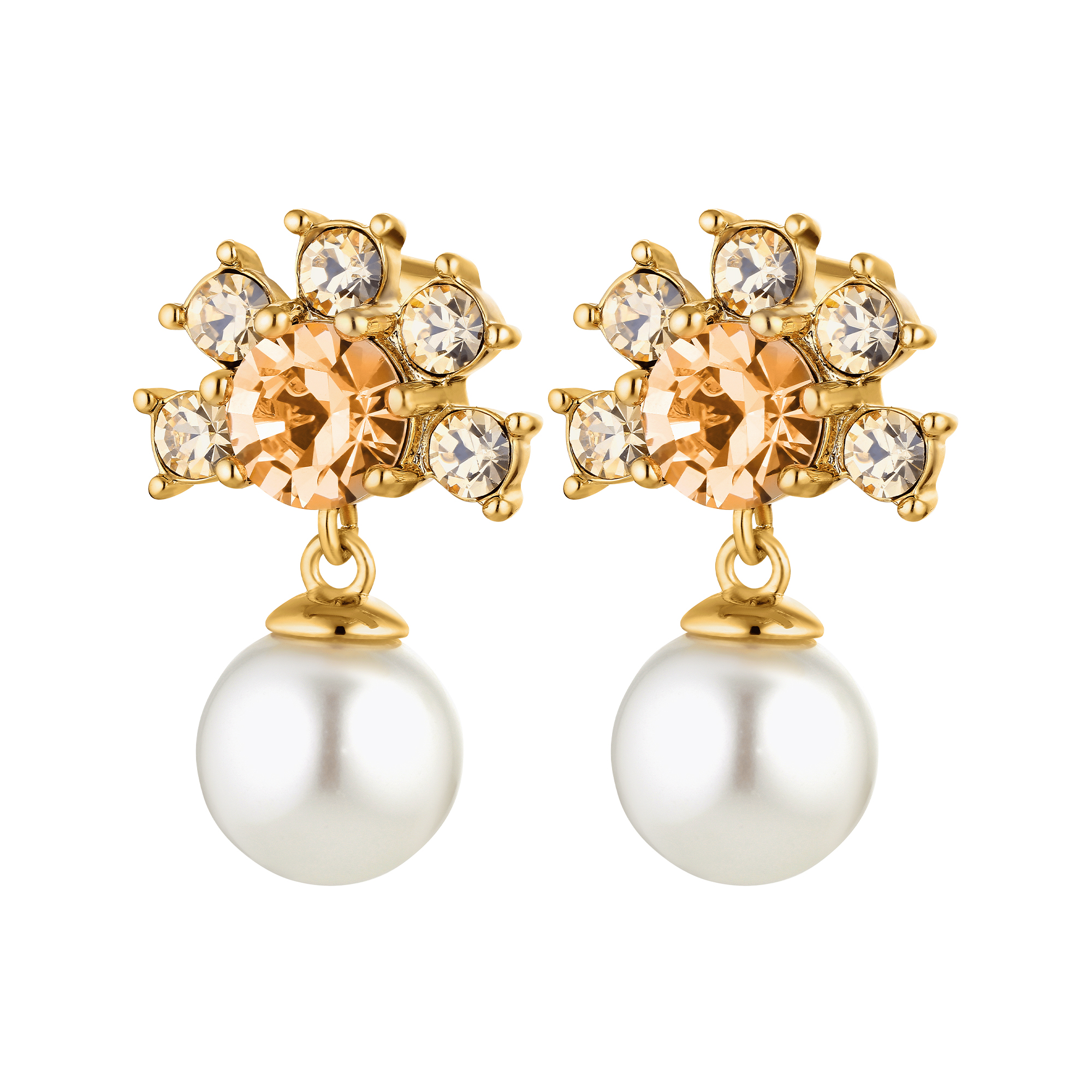 Dyrberg/Kern retrostiilis rippuva pärli ja säravate kristallidega kõrvarõngad VERONICA SG Peach.