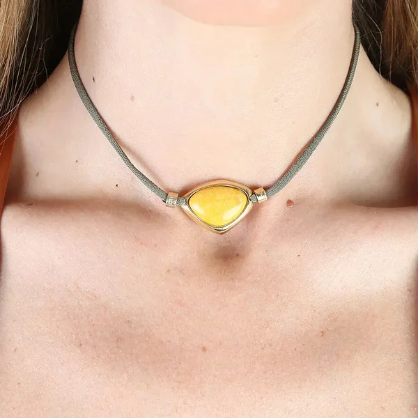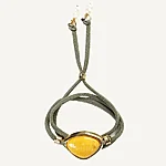ÉMOLO kergelt veniva oliivirohelise paelaga ehe, mida kaunistab kollane amasoniit. Reguleeritav pikkus võimaldab kanda nii kaelaehtena kui käevõruna.
