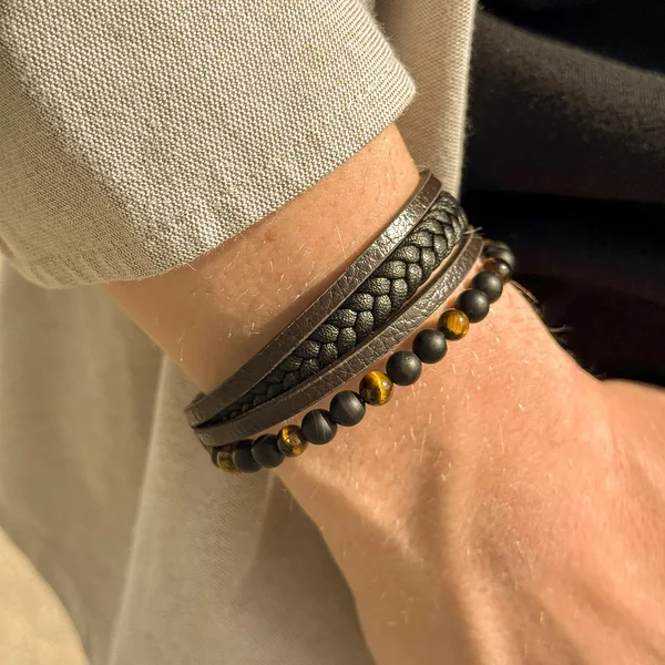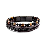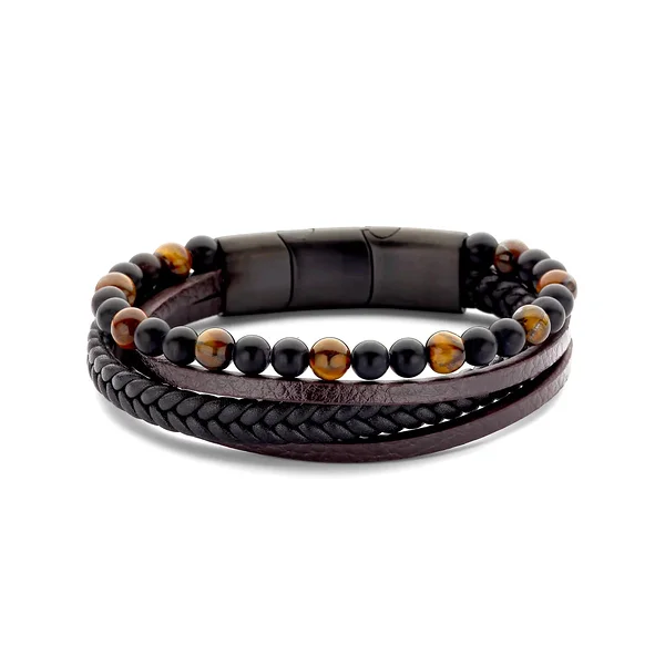 FRANK1967 robustse disainiga mitmerealine käevõru. Omavahel on kombineeritud 7x3 mm punutud must nahkpael, 5x3 mm pruunid nahkpaelad ja 6 mm poolvääriskividest helmed.