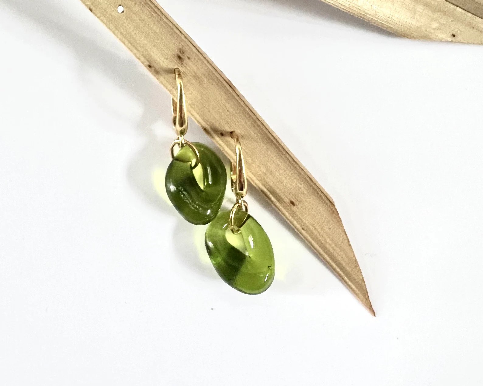 Läti klaasikunstniku Ieva Birgele käe all valminud läbipaistvast oliivi rohelist tooni klaasist kerged kõrvarõngad. Puhas ja lihtne disain. Orgaanilise kujuga Glass Berries ehted on valminud käsitööna, mis teeb iga ehte unikaalseks.
