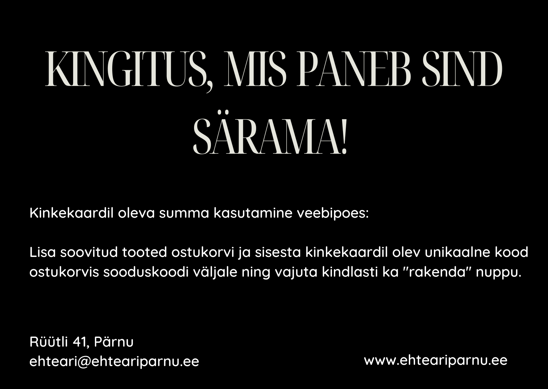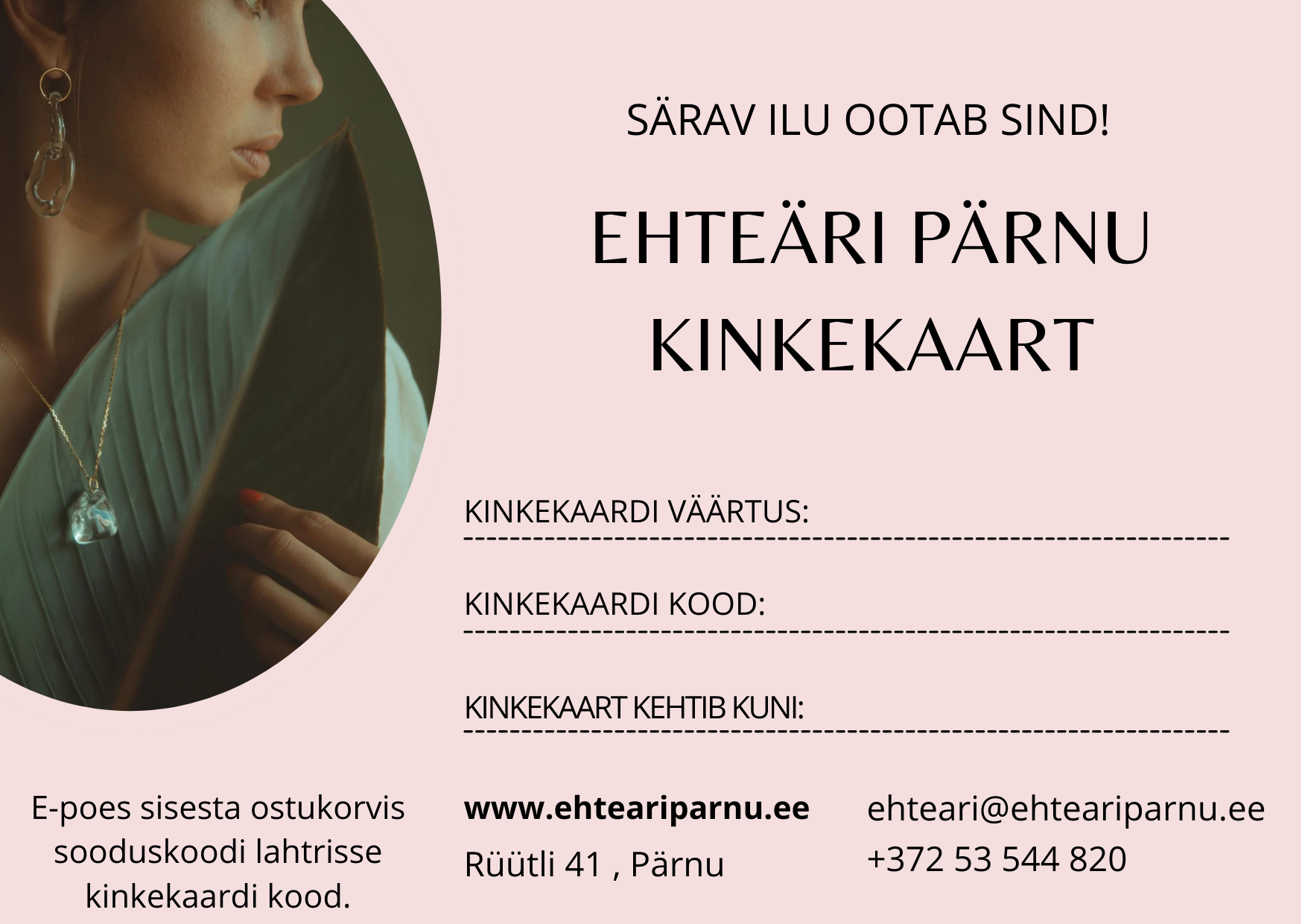 1. Kinkekaarti saab kasutada maksevahendina Ehteäri Pärnu kaupluses aadressil Rüütli 41, Pärnu ja veebipoes www.ehteariparnu.ee