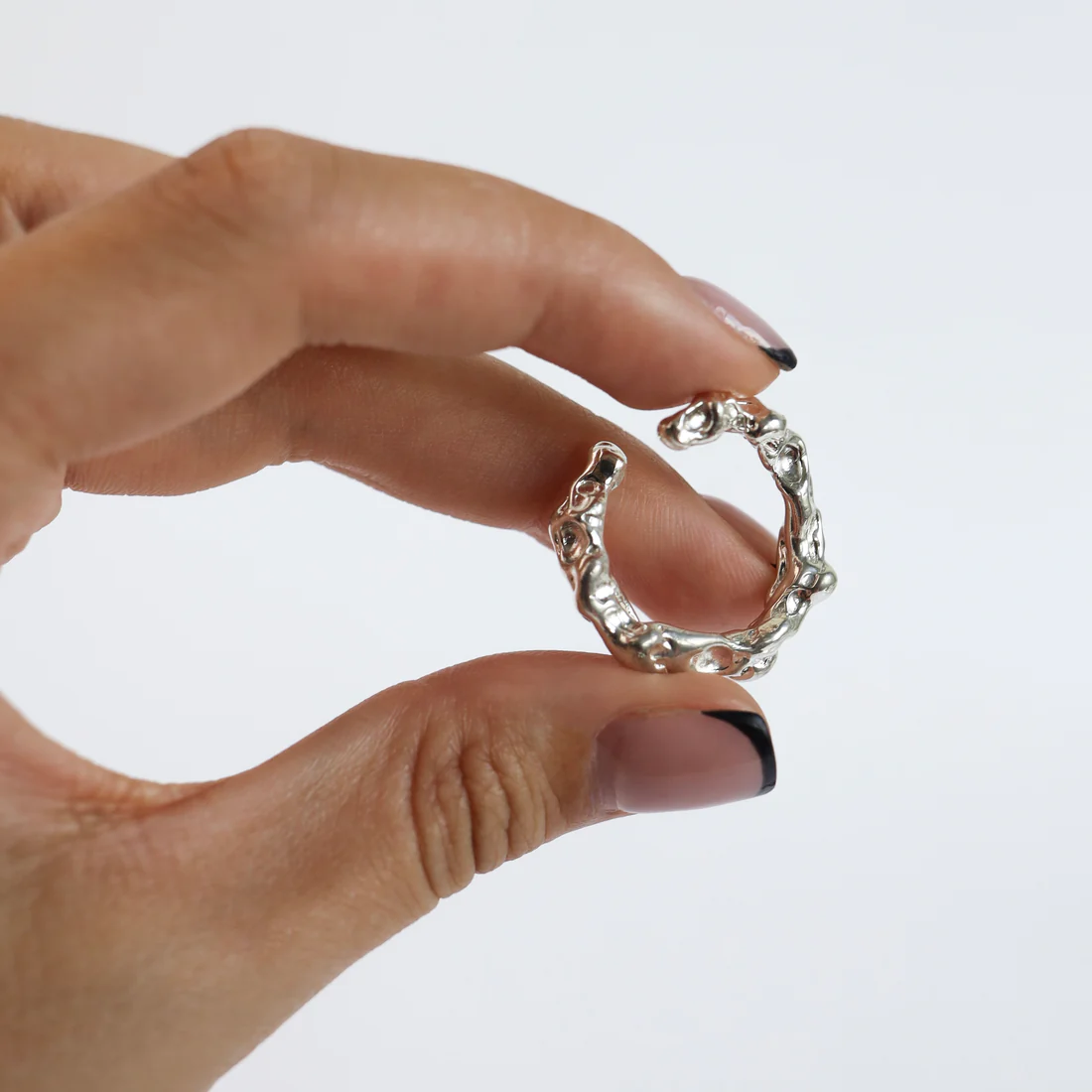 Ehete dünaamiline vorm sünnib käsitööna põimides klassikalisi kullassepatehnikaid ja tuld - esmalt tegutseb disainer skulptorina ning seejärel töötleb loodud vahast ehtemudelit leegiga.Kõik ehted valmivad taaskasutatud väärismetallidest.